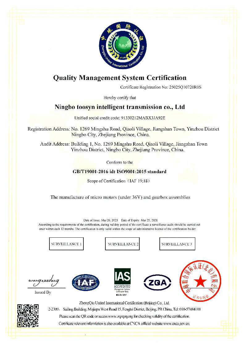 Toosynは、メカトロニックオートメーション製品の研究開発、製造、販売を専門とするハイテク企業です。遊星歯車減速機、遊星歯車モーター、ブラシレスモーター、エンコーダ、電動リニアアクチュエーター、自動車用モーター、ロボット用モーターなど、高品質なコアコンポーネントの提供に尽力しています。お客様のニーズに合わせた包括的でインテリジェントなトランスミッションソリューションを提供することが私たちの使命です。